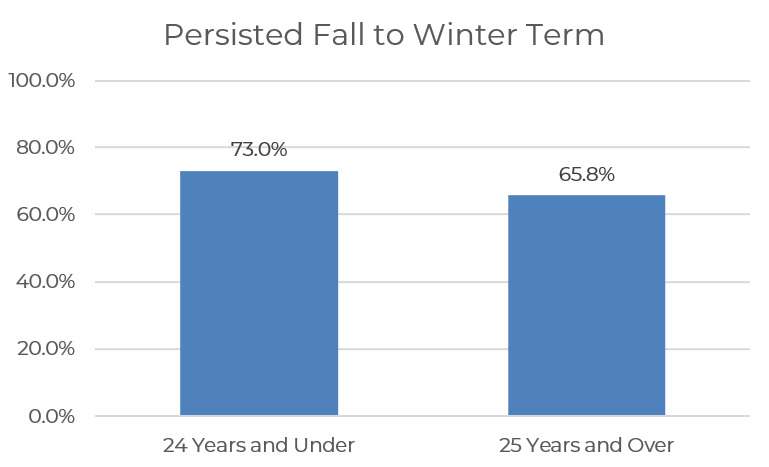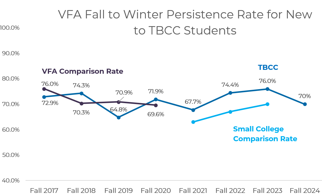 The percentage of first-time at TBCC students in the fall term that return in winter term